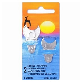 Pack of 2 aluminium needle threaders. Pony design needle threader helps threading the eyes of the smallest needles by means of a diamond-shaped steel wire attached.
