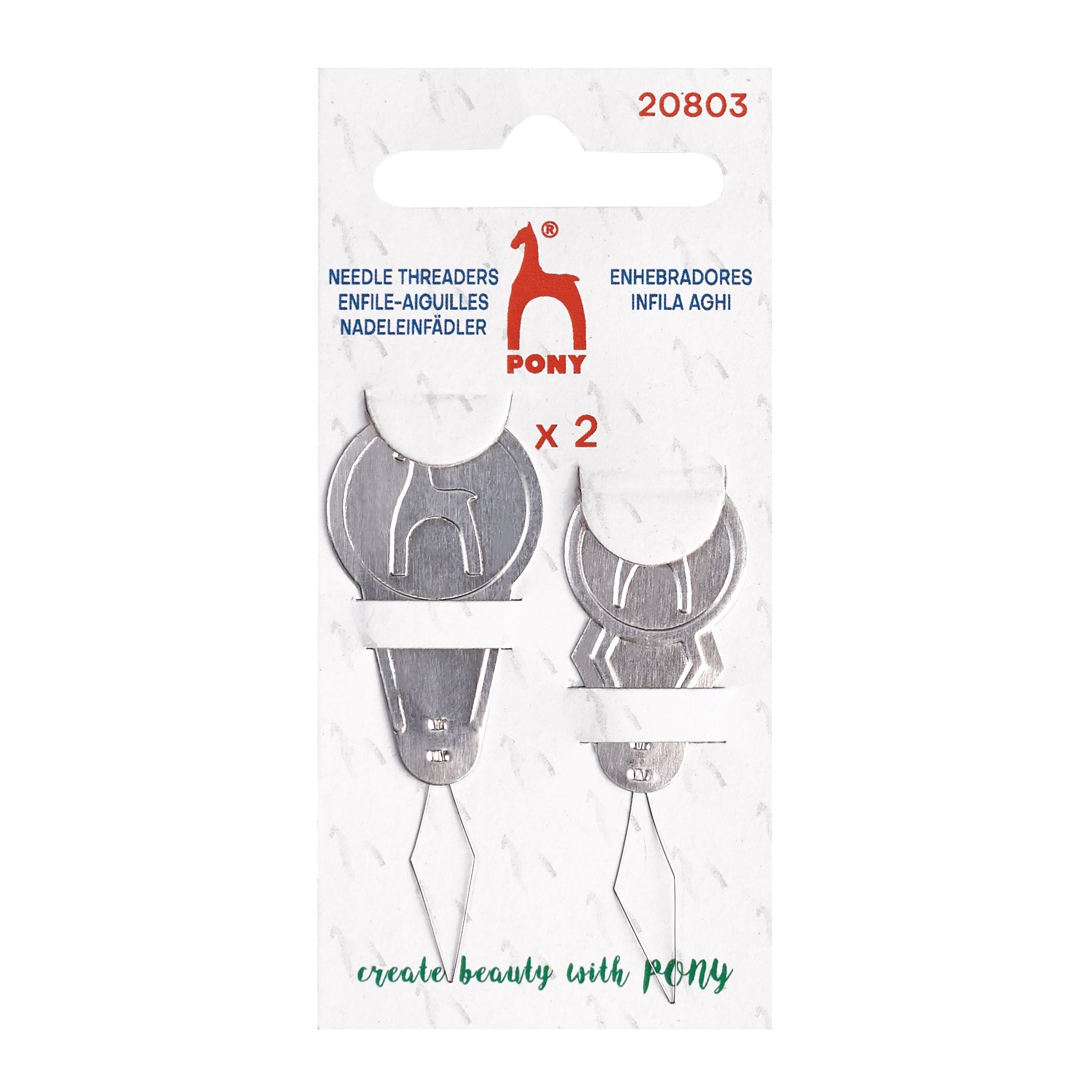 Pack of 2 aluminium needle threaders. Pony design needle threader helps threading the eyes of the smallest needles by means of a diamond-shaped steel wire attached.